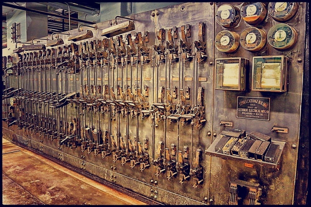 what made this potential salvage remarkable, was the discovery of a completely intact and well-preserved gargantuan switchboard installed in 1915 by the cuthbert electrical mfg. company. the board contains a wall of interconnected slate panels, watt and voltmeters, knife switches and so on.