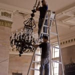 - the same chandelier prior to restoration – at the time, their was debate as to whether we were going to be charged with the task of taking it down