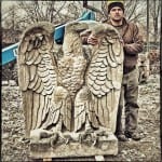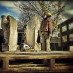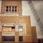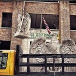 in a single afternoon, six gargantuan hand carved limestone eagles were carefully hoisted from their perches that wrapped around three sides of the bunte candy factory water tower prior to demolition. the massive prairie school style factory complex was designed by the notable chicago-based architectural firm of schimdt, garden & martin in 1919.