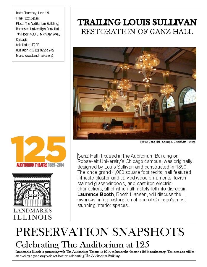 12 Jun restoration of adler & sullivan’s ganz hall lecture takes place on june 19th June 12, 2014 in Events & Announcements, Miscellaneous by Eric Share