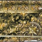 the elaborate and effortlessly flowing organic design motifs integrated with geometric form is a unique interpretation an/or hybrid of both louis h. sullivan and george grant elmslie’s design elements used in their commissions. the subtle, yet in many ways brilliant color scheme, provides added depth and dimension to a system of ornament that is rather complex and very much alive.