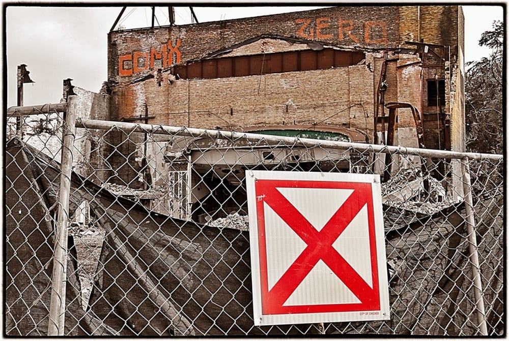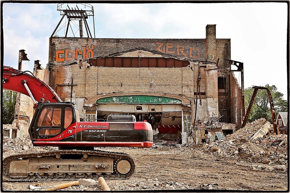 last sunday i discovered that the lawndale theater was not only being demolished, but is nearly gone. i was aware that the city stamped it with the “red x” warning placard originally affixed to the exterior facade (later moved to the fence surrounding the site), but i had no clue as to when demolition would begin.