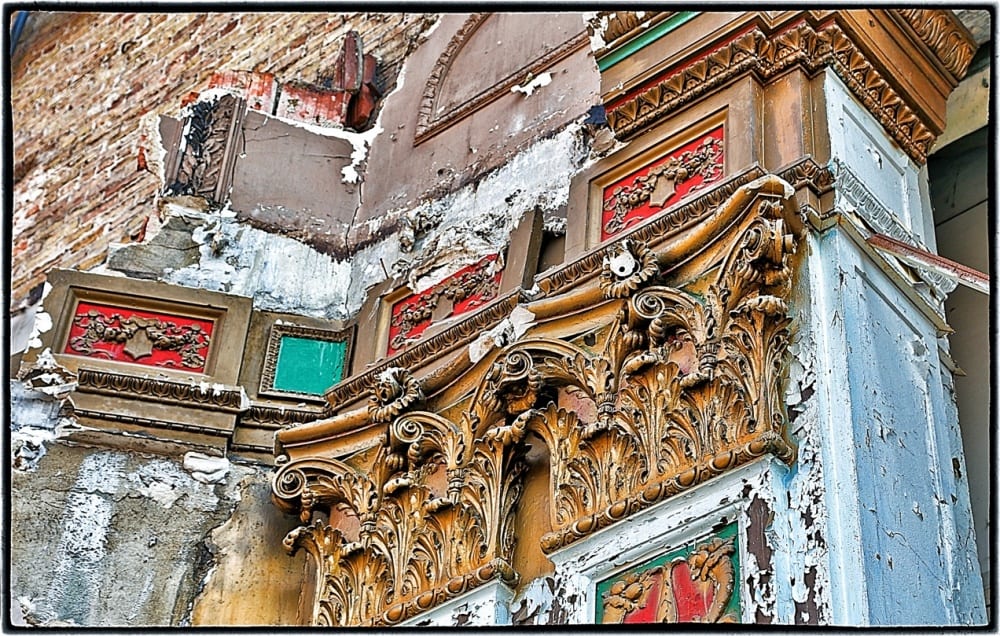 it was eerily silent and quite peaceful – i felt i could breath, and thus focus or get lost in my “zone.” i didn’t feel rushed, nor distracted. now that the building was exposed on multiple levels, i spent a great deal of time making mental notes of its construction. i had the light of day to aid me when viewing the most intimate details of materials and methods that were employed to build this once grand movie palace back in 1927.