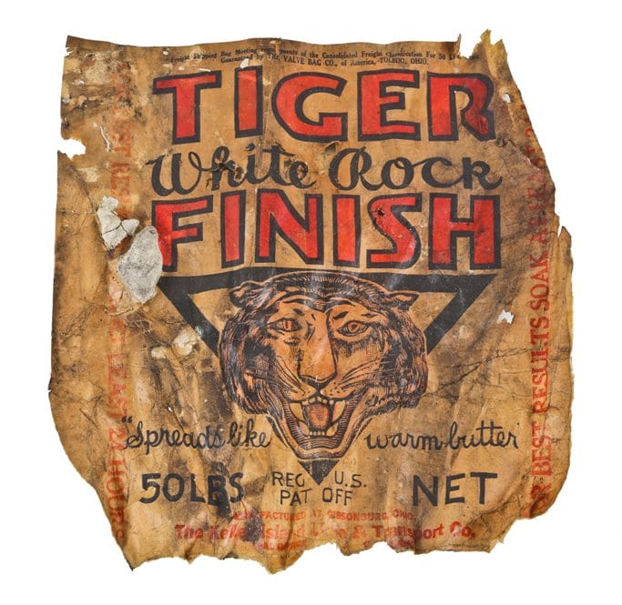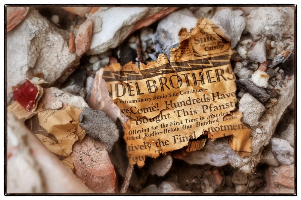 after capturing several photographic images to my satisfaction, i decided to explore surrounding piles of debris scattered about. during that time i came across a largely intact cast plaster cartouche (two were made, flanking the proscenium) buried deep in the rubble – i had to have it. in addition, i found newspaper fragments and an original empty bag of “tiger brand” white rock finish (i.e., hydrated lime) used as a base coat for plasterwork.