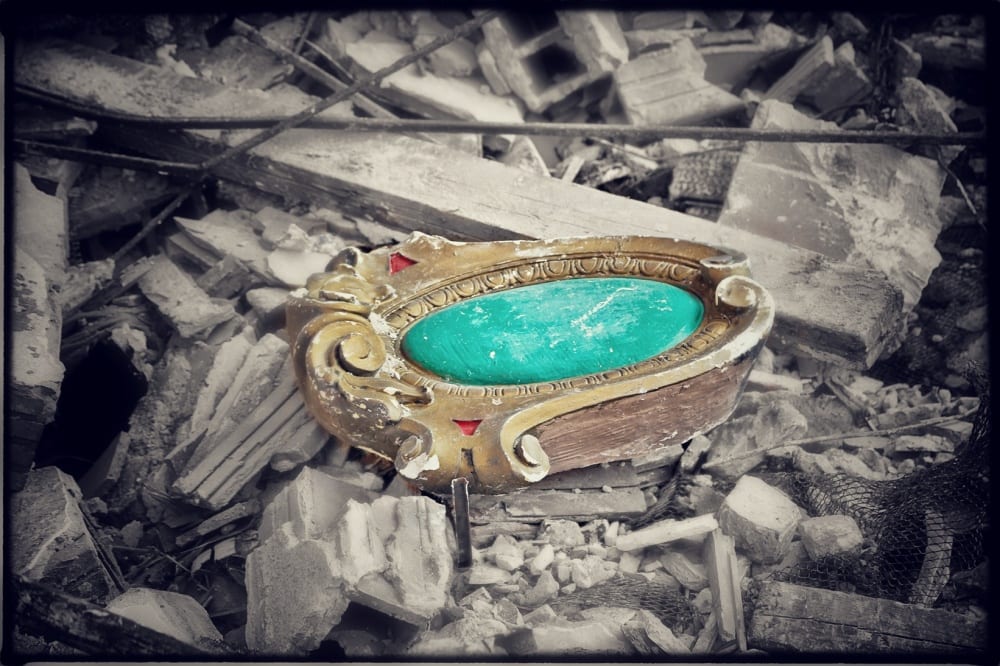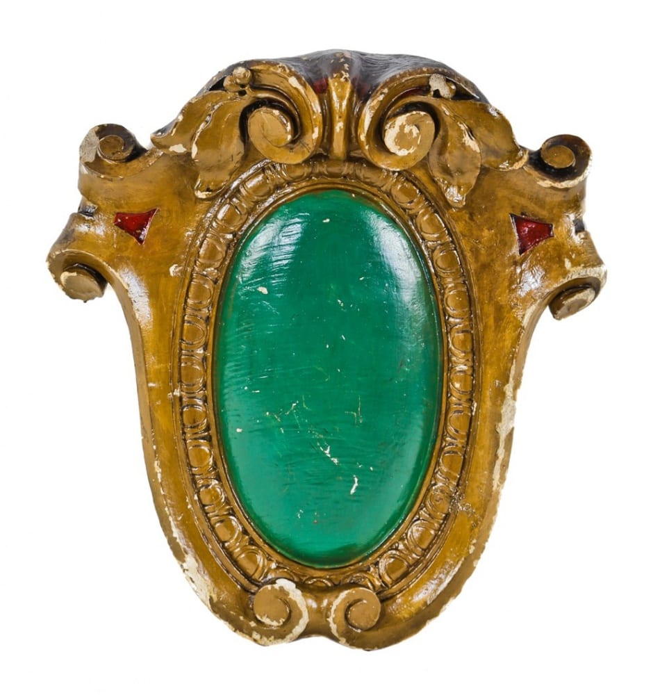 after reviewing my photographs taken while i was salvaging the theater’s interior years prior, i decided to add a few more photographs in the gallery. the four additional images depict the following: items i found while exploring the underside of seating in the auditorium, the horribly neglected projection booth (likely untouched since the 1950’s when the theater was then known as the rena), an eerie shot of one of the long-forgotten dressing rooms backstage and finally, the plaster fragment i recently retrieved “in situ” from the auditorium. note: the recovered cartouche shot in the studio is shown below.