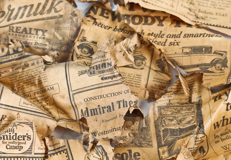 none of this was surprising based on my prior salvage experiences in movie palaces. i would frequently discover or rather uncover newspapers, blueprints, bottles, trowels and other interesting articles tucked away as personal “time capsules” placed there either as “filler” or as a quick and easy way to discard waste when suspended high above on the scaffolding.