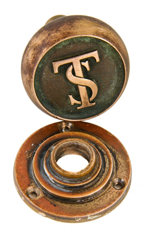 a striking chrome-plated art deco lobby elevator directional arrow indicator plaque with pressed glass insets and a monogrammed office door bronze handle, were recently acquired from the art deco style cincinnati times-star building.
