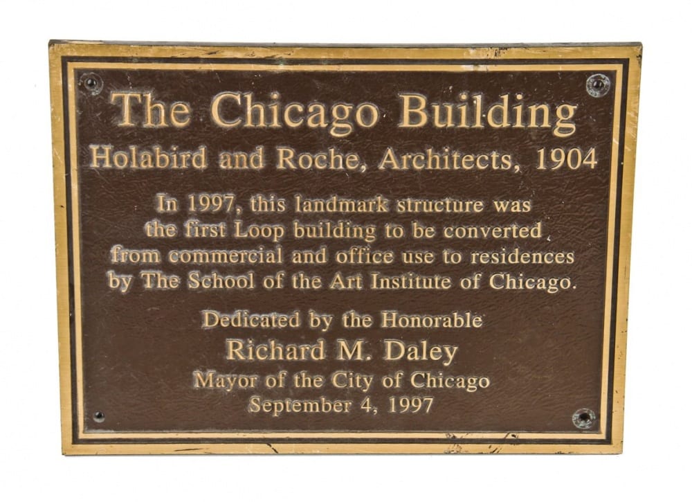 the name plaque was likely installed shortly after the building was completed. the otherplaque – dated 1997 – was dedicated by then-mayor richard m. daley during a ceremony recognizing the landmarked chicago school building as the first in the loop to be converted for residential use.