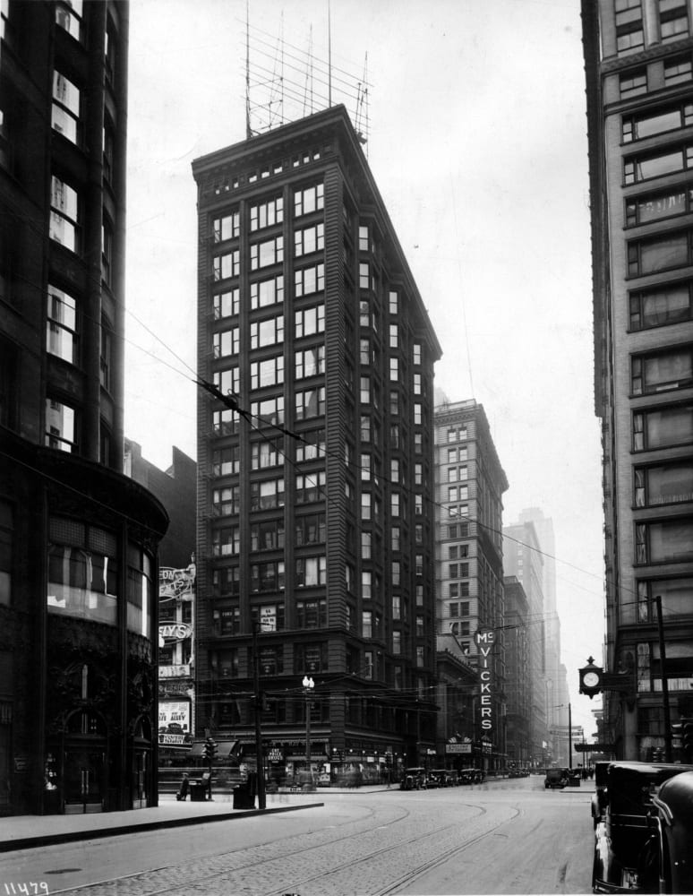 the extant structure remains an exceptional early and highly visible example of the chicago school of architecture. the chicago building’s exterior features characterize this style through the use of large “chicago windows,” a metal frame skeleton, protruding bay windows, and a terra cotta curtain wall.