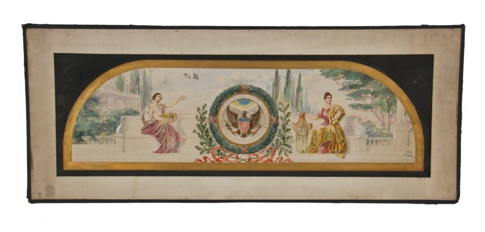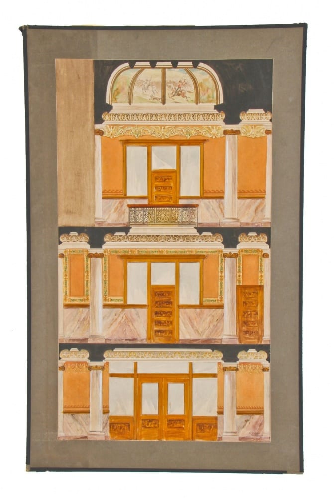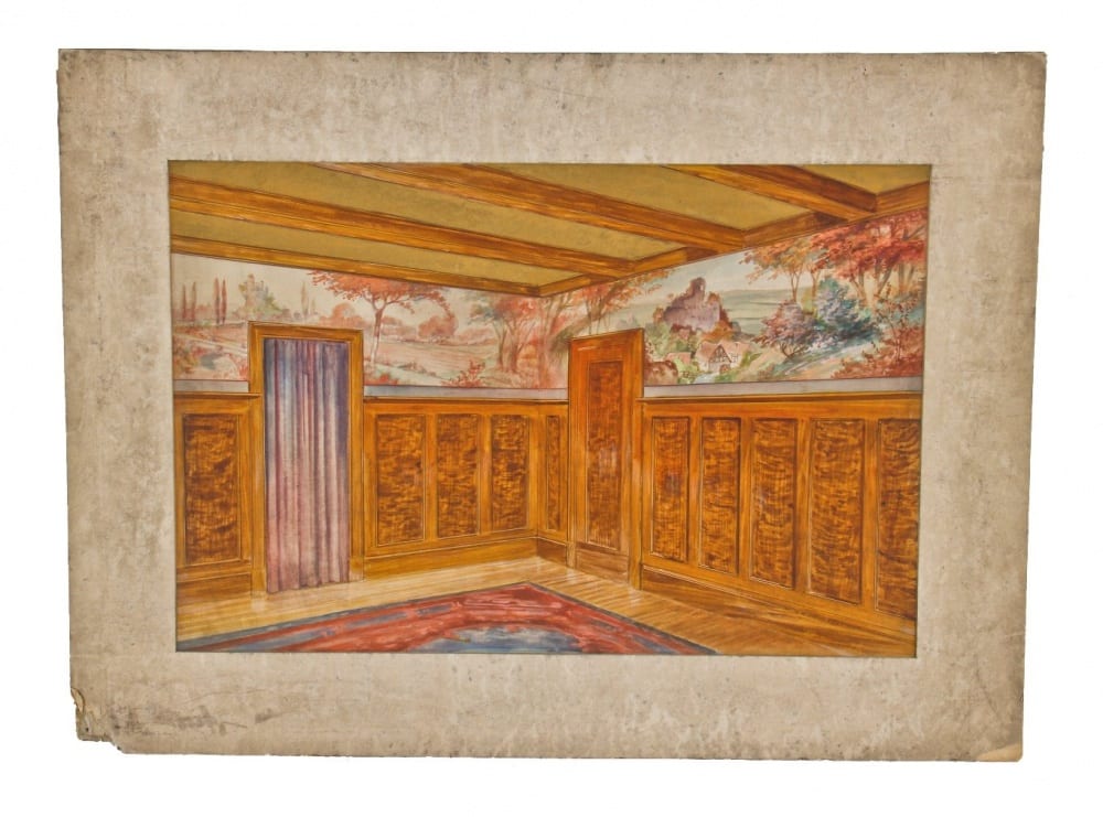 the following images represent the beginning phases of systematically documenting the large body of work created in the odin j. oyen studios around 1900 to 1920. i’ve included a few brilliantly colored matted watercolor architectural renderings of interiors designed by either the hand of odin j. oyen or axel edward soderburg, who joined the firm in 1903 and would overtime, become head designer of the firm and execute a great deal of the firm’s mural installations for several notable commissions.