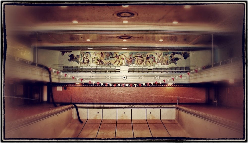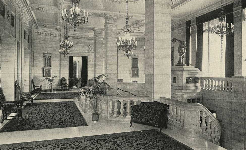 the interior boasted a gargantuan marble-clad lobby, with ornamented bronze chandeliers and gilded plasterwork. in addition, the building contained stunning ballrooms, a reading room and a pool room bedecked with nautical-themed polychromatic enamel tiles found along the walls and floors surrounding the pool.