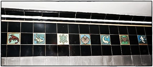 so with a little background provided to set the tiles into a meaningful context, i to you present some descriptive information and photographic images of the pool room’s wall tile that i’m so very thankful to have rescued. how tragic would it be if these tiles were not saved or at least documented “in situ?”