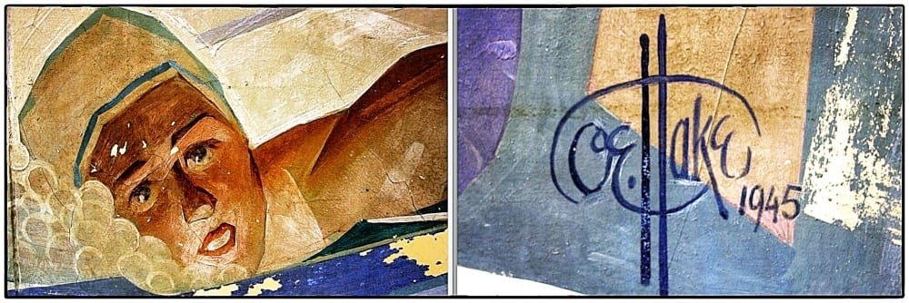 the hand painted wall murals added in the 1940’s were also of interest, but by the time my work there was drawing to a close and i had to hand over the key, i had only a very slim chance of attempting to save them. i was told that i could take a shot at rescuing them before interior demolition was set to begin, but i never received the phone call giving me the green light. by then, the bobcats had entered the building and began tearing apart the pool room.
