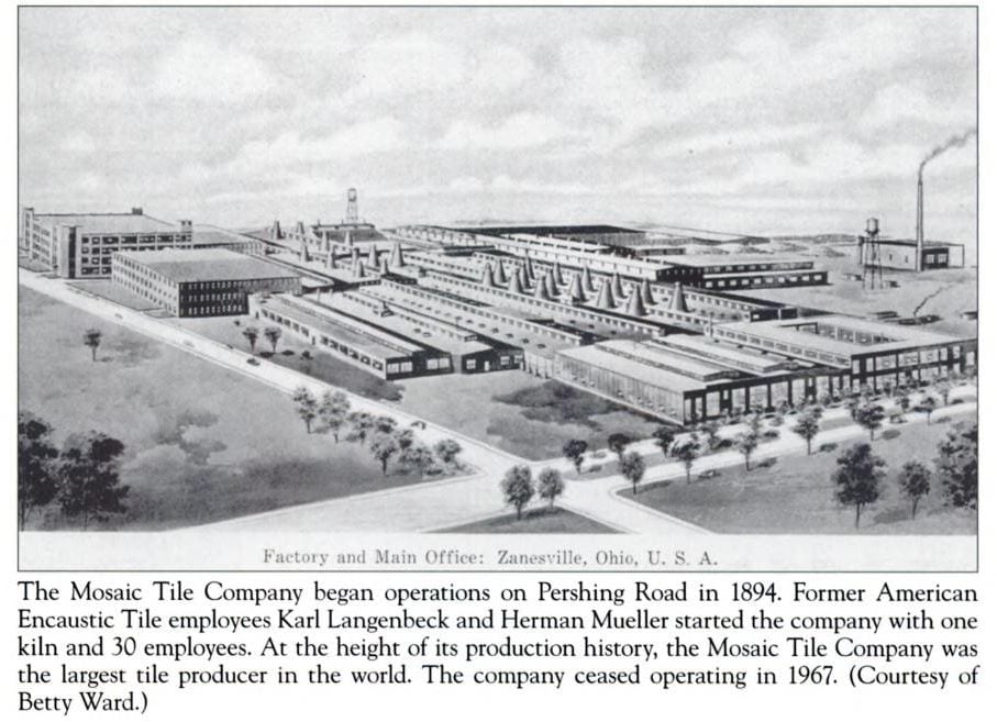 after we carefully removed mortar from one of the salvaged tiles, we found a lightly incised encircled monogram that turned out to be the mark of the mosaic tile company of zanesville, oh. the company was established in 1894 by karl langerbeck and herman mueller. notable potter, frederick hurten rhead, work for the company from 1922-23. a vast selection of ornamental and plain tiles were fabricated in their factories until 1959. the company ultimately closed in 1967.