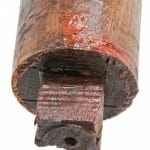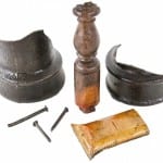 the oversized cut or “square” nails removed from the joists were carefully cleaned and photographed with the visual characteristics of the nail heads evident (i’m finding more and more of these nails containing the slightly raised circle). the other artifacts include plumbing waste pipe fragments, a slid walnut turned staircase spindle with interlocking pin, a partial wood sign letter with the original gilded paint and a nicely allover crazed finish, consistent with age and finally a refinished section of the tongue and groove sub-flooring that was nailed directly against the joists.