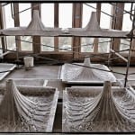 i managed to capture the early stages of fabrication and preparation for installation of the “drooping tip” ceiling panels during my visit last week. production of the intricately detailed and well made faithful reproductions (taken awhile back from a mold of an original surviving panel) has ramped up considerably. additionally, the 8th floor dining room, where the panels were originally installed when the building was constructed in 1893, is completely filled with an intricate web of scaffolding in preparation for installing the newly created panels.