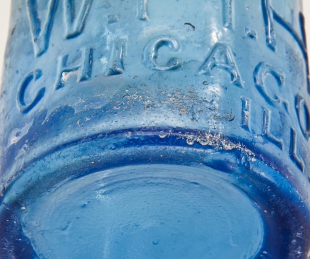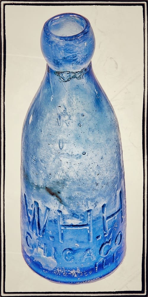 as one of my workers began gathering materials to be transported and studied further at the shop, i took a quick break and photographed, in great detail, any and all of the distinctive characteristics and existing condition of the privy’s wood lining (which turned out to be a depth of five feet or so), with emphasis on the floor and wrought iron hoops used as reinforcement. i then took one last stab at a small section along the wood floor that i felt wasn’t “combed” through to my satisfaction. i was absolutely thrilled to discover additional artifacts, including (perhaps most importantly) a light cobalt blue embossed “pony type” w.h. hutchinson bottle that was introduced in 1855. by closely examining the bottle’s physical appearance and/or characteristics, i can, with utmost certainty, pinpoint the date of fabrication to 1855-58, when changes in the company resulted in the production of a different style of bottle.