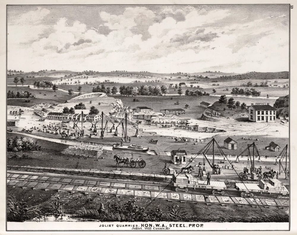 throughout most of the 19th century joliet’s numerous quarries were supplying chicago (and other midwestern cities) with great stone slabs used in the paving of city sidewalks, along with several churches, hotels, banks, warehouses and other types of public buildings. the stone was found just below surface level and quarried to remove the covering from the horizontal layers. slabs were then broken or cut down to the required size and form and lifted out with bars slipped under rollers and onto the canal-boat or railroad car for transport to surrounding cities utilizing this stone for construction purposes.