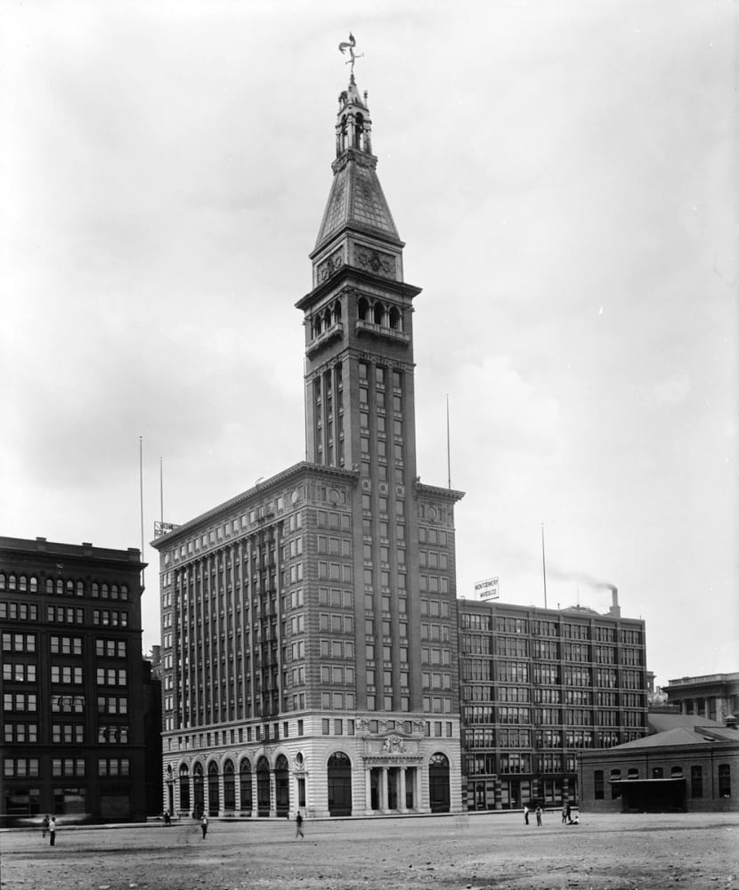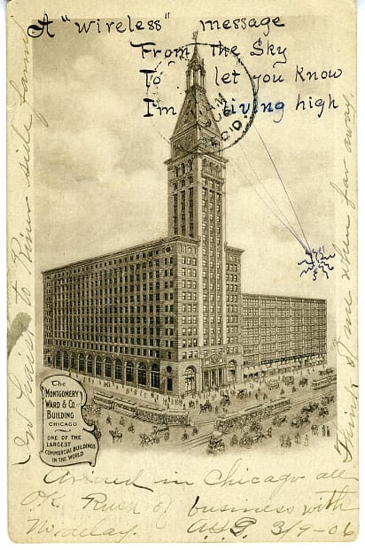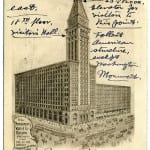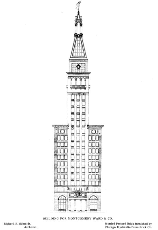the extant (although heavily altered) montgomery ward & co. tower building was designed by the notable chicago architect richard e. schmidt in the late 1890’s. the 12-story building was of steel frame construction with a tower and a single basement resting on 50-foot woodpile foundations. the massive weathervane or statue (depicting the greek goddess diana), known officially as “progress lighting the way for commerce” was modeled by scottish-american sculptor john massey rhind and installed on october 20th, 1900. at the time of it’s completion, it was the tallest building in chicago at 394 feet, for nearly 20 years thereafter.