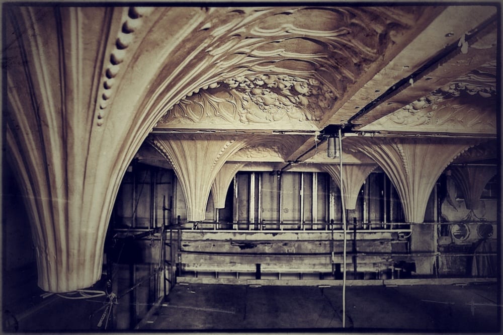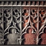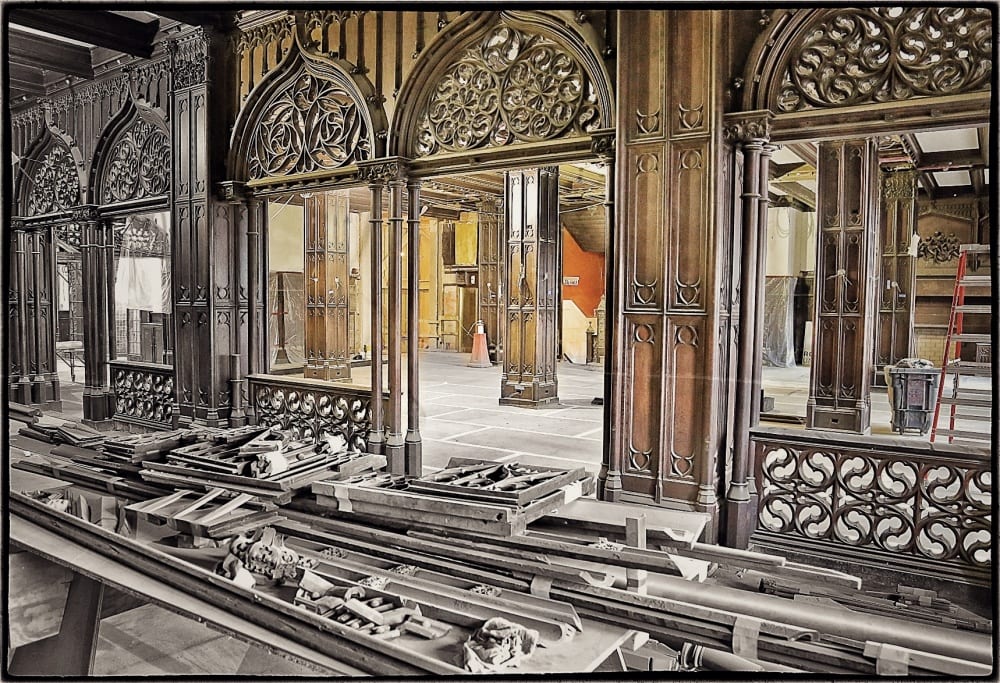witnessing (all around me) the busy work of installing the newly constructed and/or faithfully reproduced gothic style “drooping tip” ceiling panels was by far the highlight of my day. for a moment the back pain had subsided, likely from being distracted by all the bustling activity up there on the scaffolding, but my time there was drawing to a close, so i forced myself from that wonderfully serene place, where over a year ago, there was an empty room containing the broken remnants of the original ceiling that has been covered over and subsequently destroyed in the 1950’s or perhaps earlier.