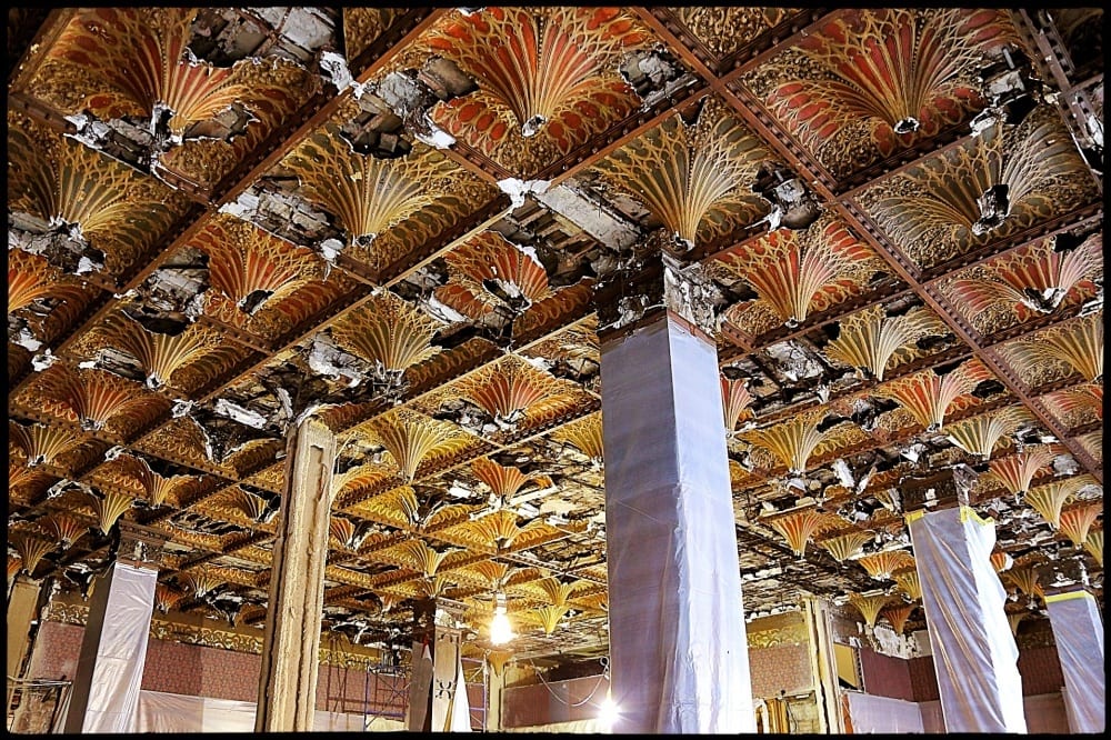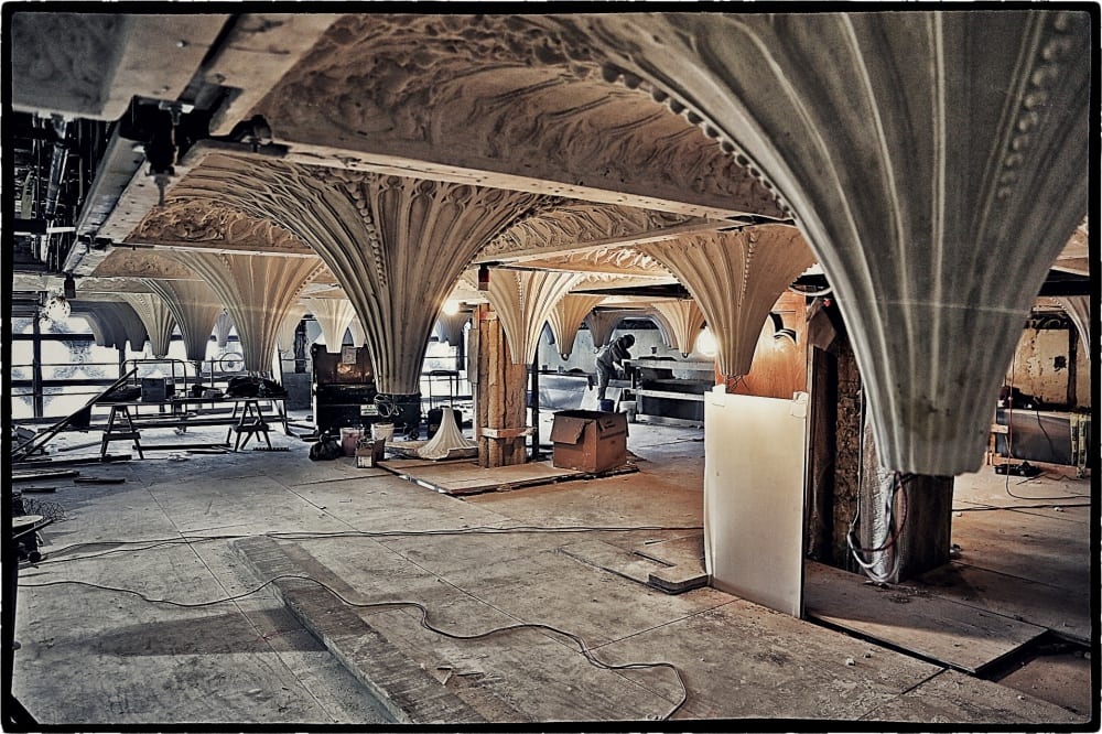changes in the lobby entrance, grand staircase, swimming pool room, 2nd floor reading room, the famous “cherry circle” bar and so on are gradually coming together, with the great majority of the historic artifacts being carefully removed, stabilized and reinstalled. since i had limited time there and my back was giving out on me, i went straight for the 8th floor to document the progress on the laborious and painstaking efforts devoted to recreate the great dining room’s cast plaster ceiling.
