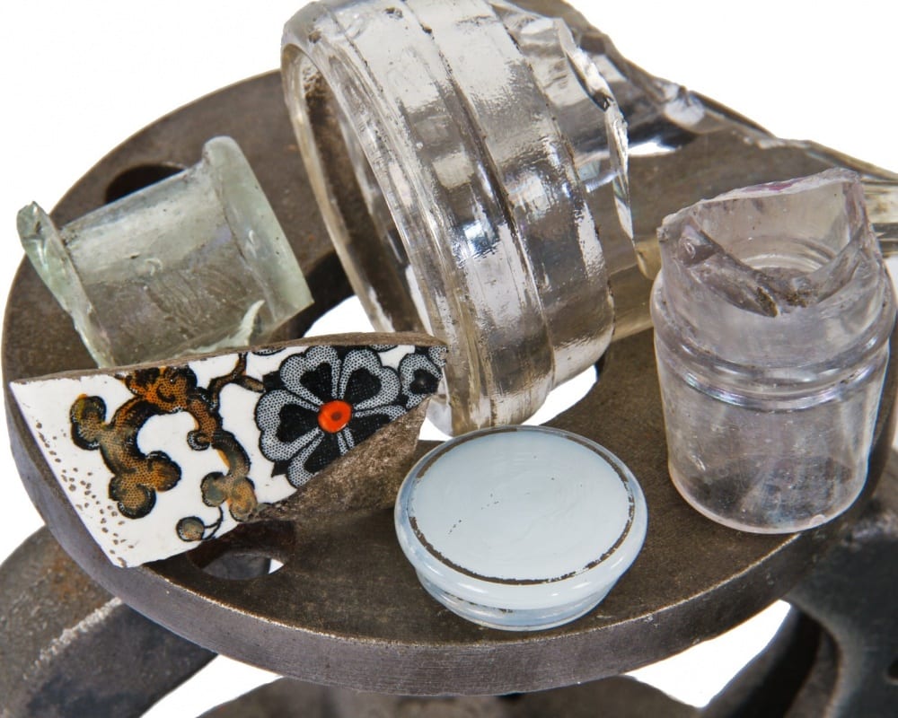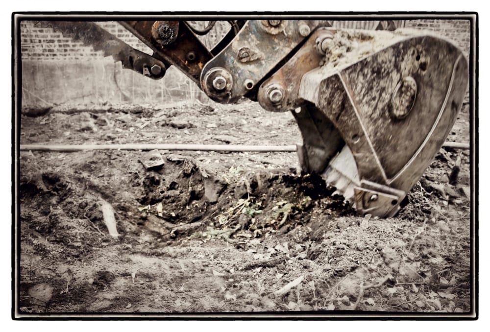 as i walked around with a makeshift map i created earlier after finding a few promising areas when prodding the soil with a makeshift steel rod probe, the wrecker rolled along side me high up in his cab. with a simple hand gesture, his massive machine would gracefully dig into the regions where i suspected privy or ash pits may likely be found. for a wrecker, time is incredibly precious, so i didn’t have much time to fully prepare for this. in other words, i had to “wing it” onsite.