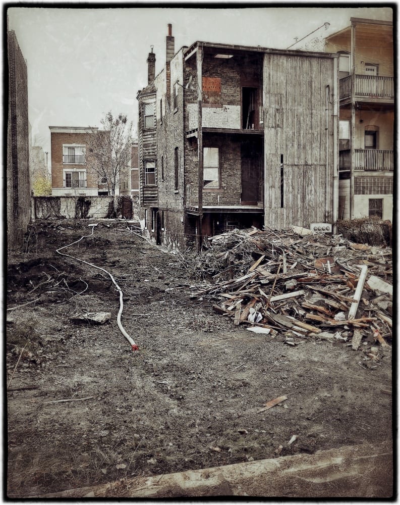 early in the afternoon we arrived at the job site during a momentary pause as the wreckers were refueling their backhoe. we took advantage of that time to quickly assess the unusually large, double lot, containing a single victorian era red brick two-flat residence constructed in the 1880’s.