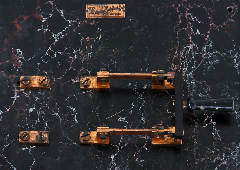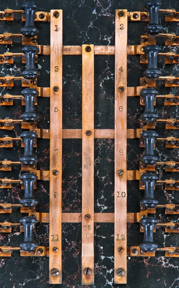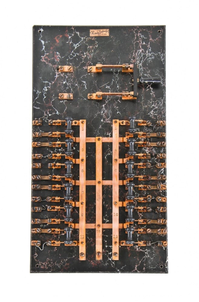 the remarkable wall-mount switchboard panel features a solid beveled edge insulator back plate with a well-executed polychromatic “faux” allover marbleized finish. the multitude of “knife” switches and interconnected flat strip busbars are comprised of solid copper. the master knife switch with single black enameled turned wood handle is positioned at the very top. the original manufacturer’s plaque is affixed directly to the slate back. each switch is equipped with an unusually-shaped black “lava” pressed and/or formed handle. numbers corresponding to the switches are deeply incised in the vertically positioned busbars. the flat head terminal copper screws are all intact.