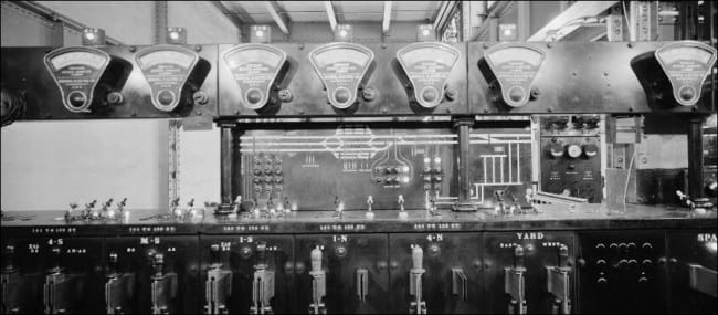 23 Dec new york city subway sub-station open or “live” front switchboard with faux marbleized slate panel