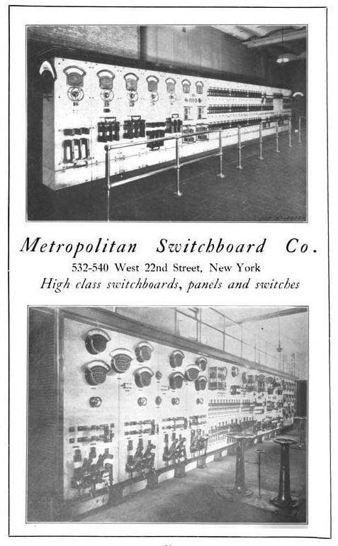 metropolitan was founded in 1892 and went on to manufacture electrical equipment in addition to switchboards well into the 20th century. period advertisements offer a glimpse at some of the buildings around new york city that were outfitted with electrical equipment.