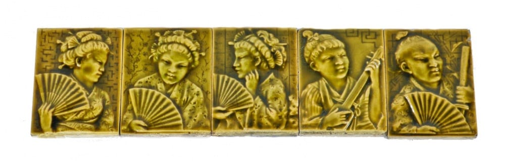 the massive lot of rectangular-shaped mottled color majolica tiles are all figural, consisting primarily of costumed geisha girls with folded fans. the heavily embossed tiles are amazingly intact with surface crazing evident. only a single tile featuring “koko, the lord high executioner” contains a black transfer print on the backside of the tile.