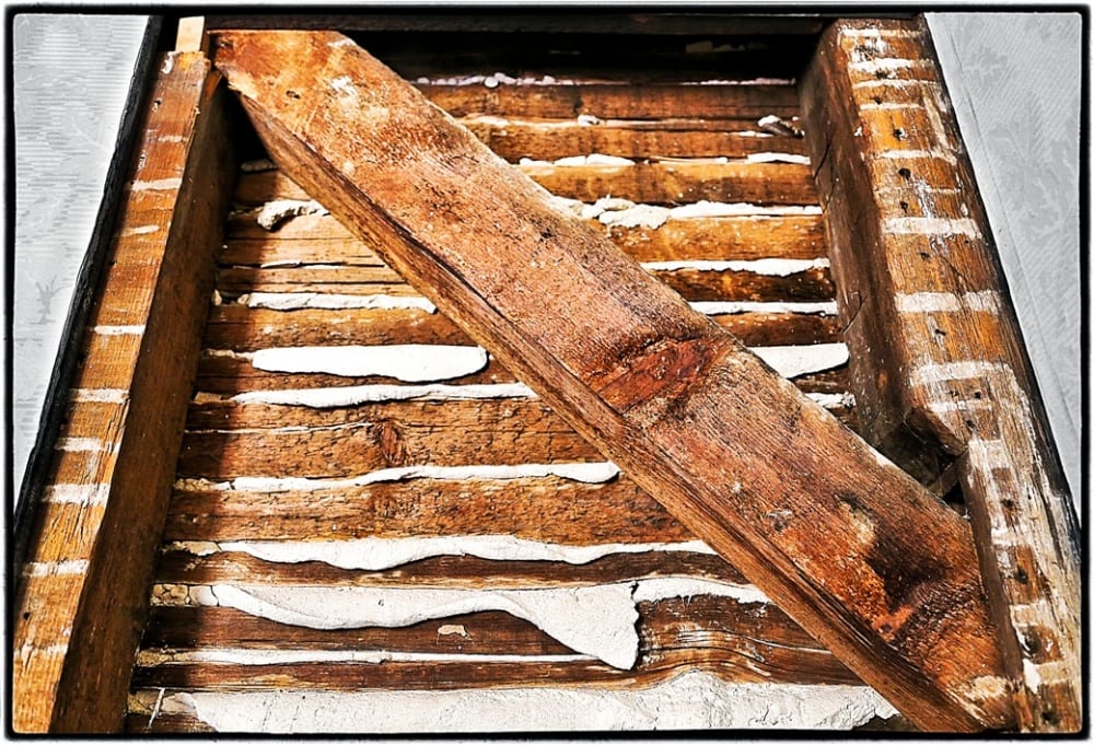 with that, i was rather pleased to carefully examine what i believe to be a “snapshot” of two distinct building methods and materials in situ. the materials and methods from 1836 where integrated with those from work performed during the 1850’s. to see an assemblage consisting of the crudity of split lath, mortise and tenon joinery, hand-hewn oak wood studs, the use of square nails and dimensional lumber (with “up/down” vertical saw marks) used together was truly a sight to behold.