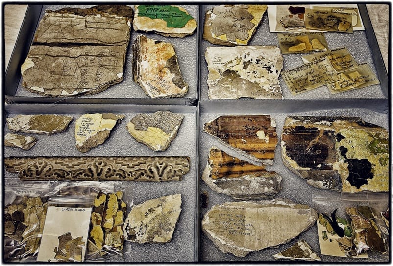 after spending an hour or so exploring the house and documenting features that i will later revisit in greater detail, i gravitated towards two areas: the first being the exposed wall in a 2nd floor bedroom, which has a unique “cross-section” that offers a glimpse of the structural components used to frame the house. the second and last area i spent the remainder of my time in was the archives room, where i reviewed loads of highly informative and deeply insightful material pertaining to anything and everything to do with the clarke house history. the room houses several boxes of meticulously documented fragments and binder upon binder of photographs that were first cataloged by hand, then implemented into a computer database by becky to make this treasure trove of information much more accessible.
