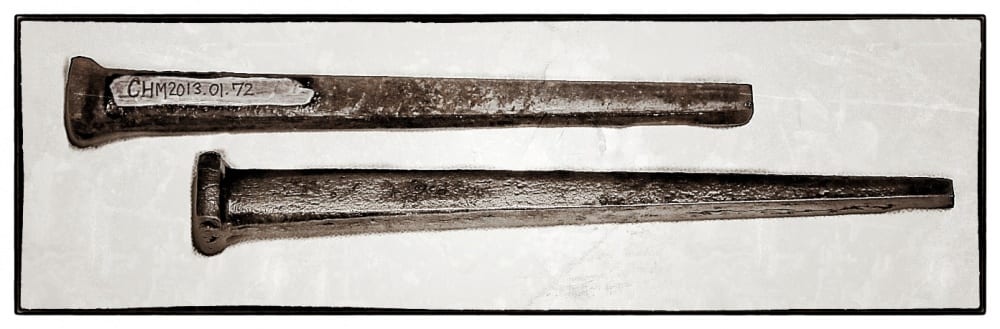 what struck me immediately were the similarities i observed between the the john kent russell house stud section (brought with me) and a clark house diagonal brace located “in situ.” the unusual size and surface characteristics of these old growth white pine wood framing components were virtually the same. it made me wonder whether this “dimensional” wood brace was added in the 1850’s, especially after discovering the use of cut nails that contained similar characteristics to the nail head of one retrieved from russell, and an investigative report written by bob furhoff in 1980, which identified the framing members from the original construction as hand-hewn oak with the use of tapered wood pegs and mortise and tenon joinery.