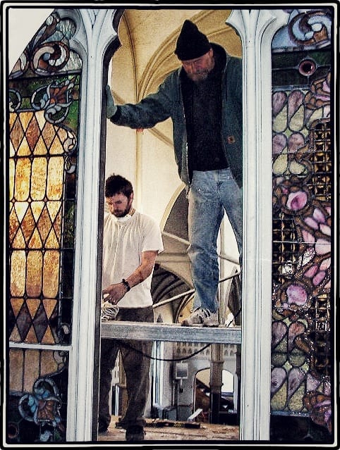 the three cathedral roll solid colored glass window sash diminutive panes were salvaged from a badly damaged three-sided bay or oriel containing one-over-one muntin or multi-pane sash windows as a result of a devastating fire that led to the structure’s demolition.