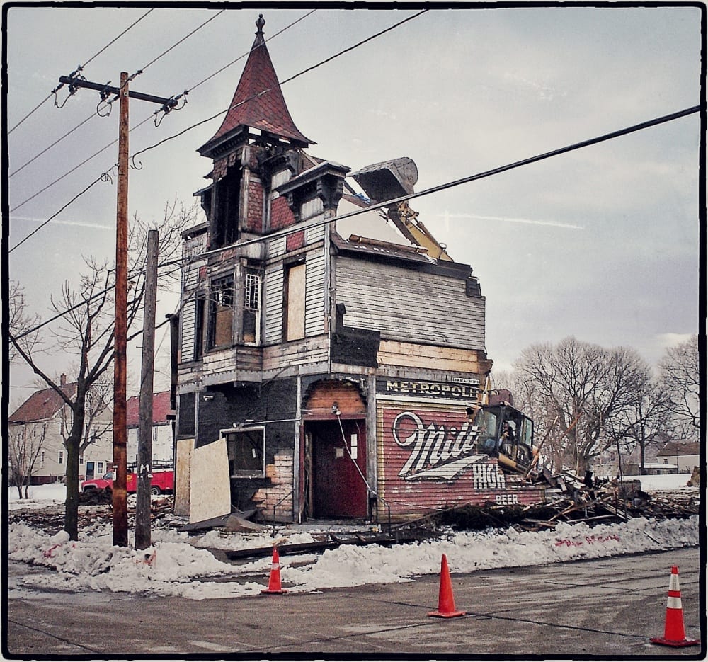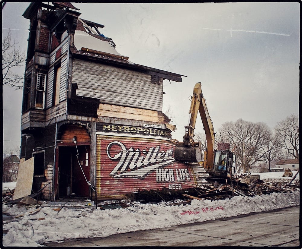 unfortunately the painted miller sign could not be saved due to the site wrecker’s failure to recognize and/or care about its importance. despite receiving a barrage of offers, in the form of monetary compensation to buy time for the sign to be removed by myself and a few others that resided in milwaukee, the pre-prohibition hand-painted sign was completely destroyed. the two images showing the tavern (and sign) being demolished, were taken by friends of mine who were limited to documenting the loss.