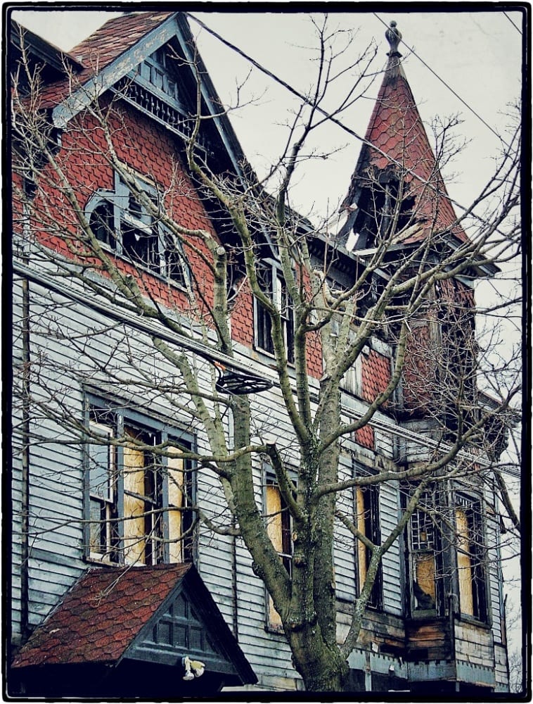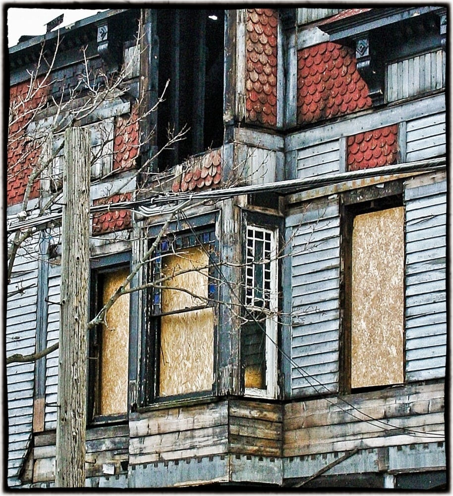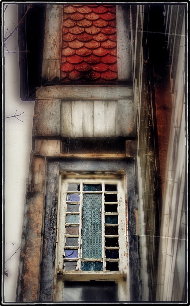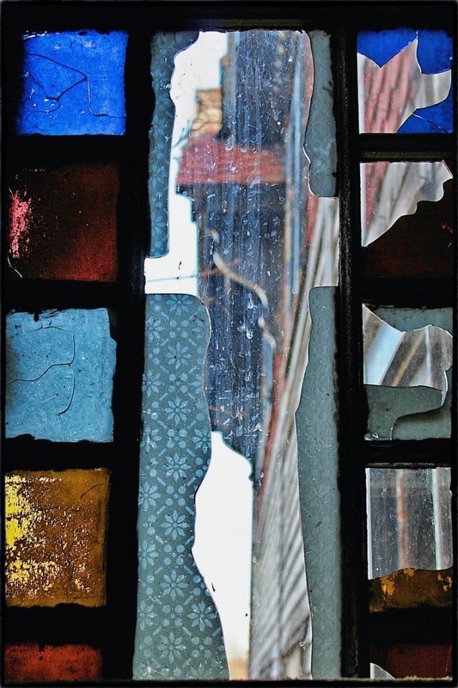 when i stood within the projecting bay or oriel on the second floor, which contained large corbels below and terminated at the attic’s roofline, i was surrounded by a three-sided window configuration, with each sash containing solid-colored cathedral roll glass squares divided by simple wood muntins. the much larger central panes of glass were treated with elaborate acid-etched designs that were badly damaged to the point where only shards of glass clung to the window frames. most of the colored glass squares were broken as well. however, i managed to secure three panels free from damage and placed them in my camera bag. after taking additional photos of the exterior and interior, i left the building and headed home.