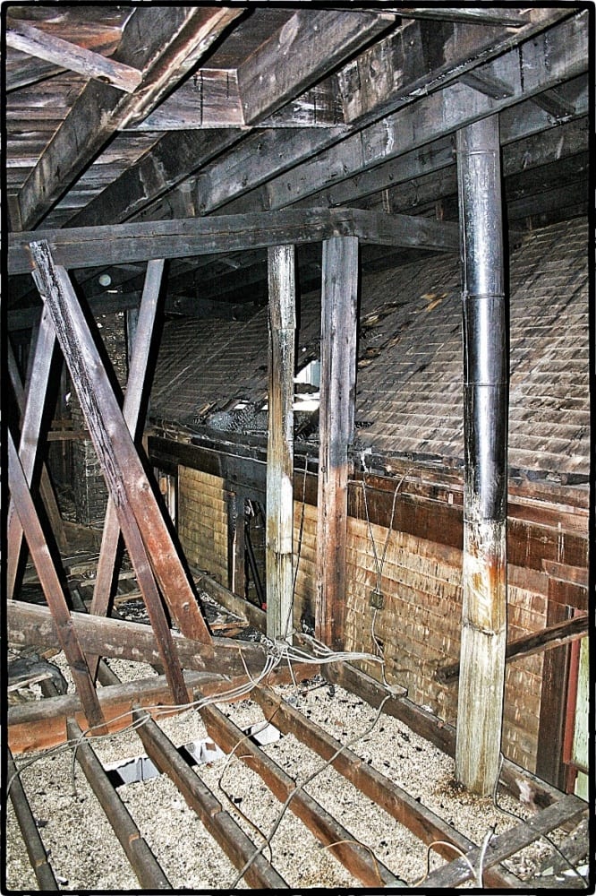 the bright orange stickers issued by the city stating that this property would be “razed and removed” was clearly an impending death sentence, but as to the exact day the demolition would happen i did not know. since the building was wide open, i ventured inside, taking images along the way. it was quite dark, very unstable and so much of it was burned beyond recognition that it was virtually impossible to capture any satisfactory images.
