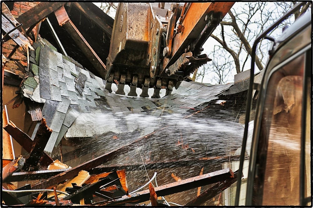 the mid-sized excavator quickly reduces the wood framed dwelling to rubble.