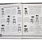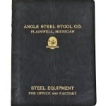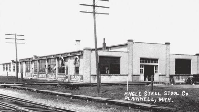 the stools were salvaged from an automotive assembly plant located in detroit, mich. each and every stool contains the black enameled manufacturers stenciled stamp, located on the underside of each stool seat. the original battleship gray enameled finish remain intact. the distinctive inward-turned ball feet are characteristic of stools designed and fabricated by the angled steel stool company.