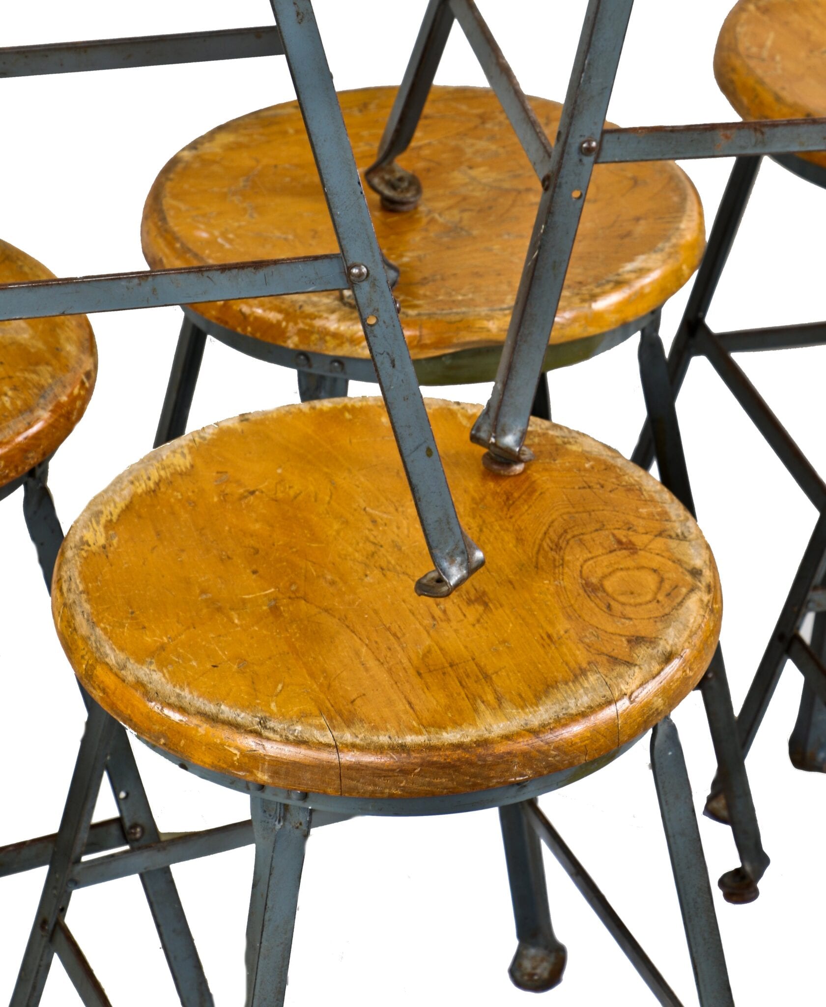 the option to have the riveted joint stools brushed down to bare metal is available, along with dividing the stools into smaller quantities for purchase. the maple wood seats can be refinished or replaced altogether upon request.