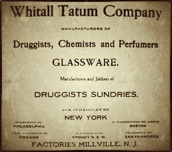 the reagent bottles – all outfitted with stoppers – were all manufactured by the whitall tatum company, with their original glassworks located in millville, new jersey. the clear and amber-colored glass bottles vary considerably in size and shape.