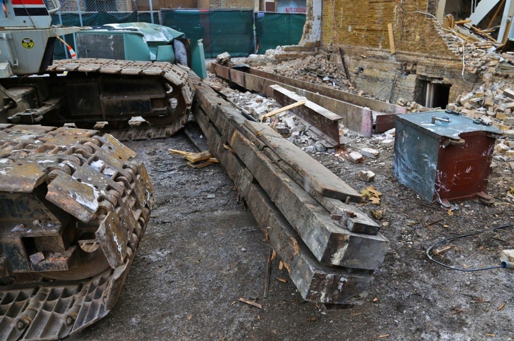 when i arrived onsite demolition was in progress, with a large crane taking apart the backside of one of the two buildings (possibly a former horse stable). the project manager is well aware that i am constantly searching for “raw” building materials to bolster my ever-growing library of carefully documented artifacts and “systems” for researching the materials and methods of chicago building construction between 1830-1890.