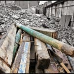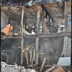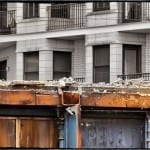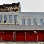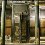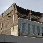 the two photographs shown below depict the first story of the c. 1870’s joilet limestone commercial building facade, consisting of large plate glass windows (capitalizing on natural light in the gaslight era), along with the setback double-door entrance and modular cast iron “storefront,” as it was first discovered and later fully exposed and pulled down with a single “tug” from the excavator’s menacing claw.