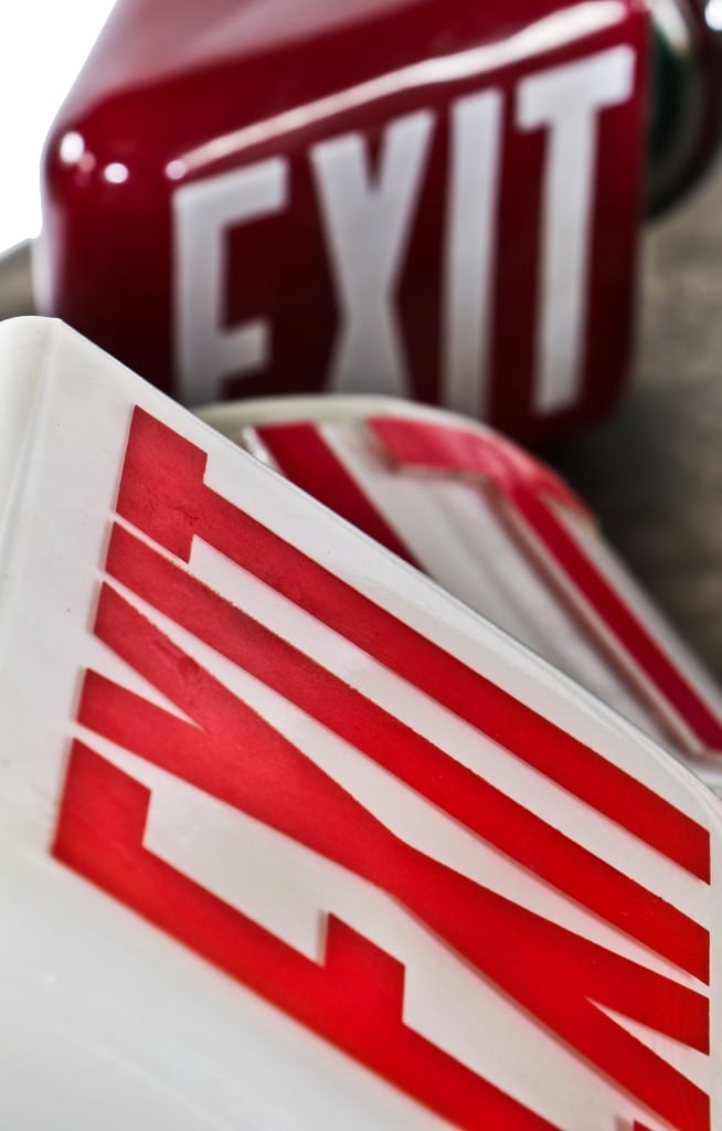 the majority of the single electric exit lights are equipped with brilliantly colored ruby red glass wedge-shaped shades with bold white lettering. nearly all of the pressed glass shades were fabricated by the kopp glass company, located outside of pittsburgh, pa.
