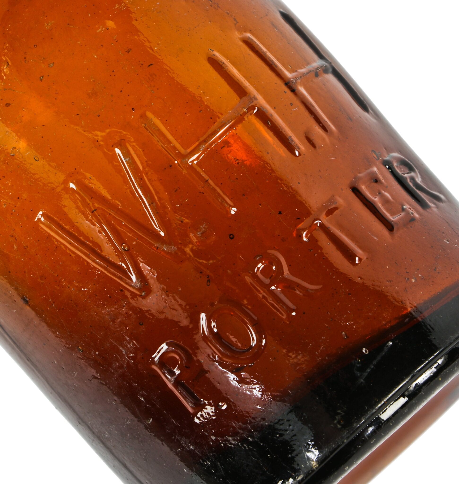 the two other bottles that found theit way into my personal/private collection are a rare civil war-era squat body amber glass william h. hutchinson porter bottle and a very rare cobalt blue pony style c. 1859-1860 w.h.h. (i.e., william h. hutchionson) pittsburgh soda bottle. both bottles contain smooth bases with key hinge mold lines and applied tops.
