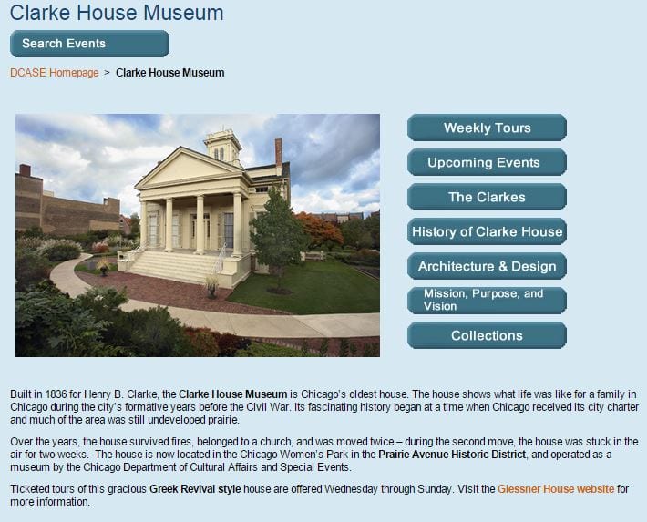 Clarke House Museum (1836) is the oldest surviving building in the original Chicago city limits. Moved twice, the Greek Revival house has been restored to its mid-1850s appearance and operates as a fully-furnished historic house, interpreting family life in pre-Civil War Chicago.