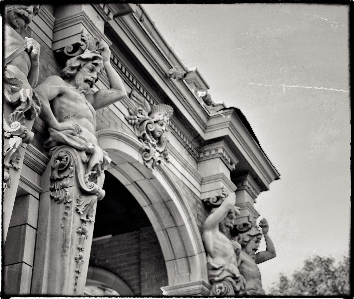 the photogallery below contains some of the images culled from the photoshoot of the mansion last weekend. had i brought additional lenses, i could have captured greater detail in the less accessible elements around the balcony and roofline. in fact, i really had no intention of writing a post about this house, since there is already a plethora of imagery and information pertaining to this milwaukee architectural treasure online. however, after reviewing images i’ve taken over the years i was inspired to share the house with those of you who are not familiar. for nearly 18 years now i have been photographing it, with the earliest photos in 35 mm format. the bulk of images captured are of the statues, and only a few show the context they exist in. i’m so very fascinated, but equally intimidated, by the figures. perhaps i’m taken aback at their scale, or surprised at their application in a residential structure.