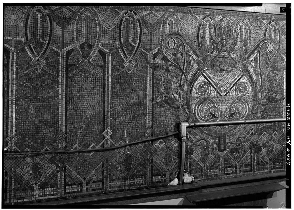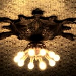 the collection of images below were taken several years ago when i had the chance to visit the guaranty building and its wonderfully restored lobby. i spent at least an hour in this somewhat confined space, where i systematically photographed the staircases, mosaic tile, stained glass skylights, elevator enclosures, yale and town door hardware and finally, the lighting fixtures. the latter were a combination of three arm sconces with vaseline or “uranium” glass shades, and visually striking cast iron ceiling medallions; they also had bryant socket clusters outfitted with carbon filament incandescent light bulbs.