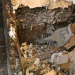 from the moment i struck through a wall near the northeast corner of the house, i knew that my suspicions about its true identity were correct. after peeling back continuous layers i am convinced this house was likely moved from the central business district sometime during the 1850’s (around the time masonry began replacing the wood-framed shanties). in fact, once i pulled back and deciphered the “insulation” resting on the sill plate between the joists, i had an approximate date of 1850-1854, based on the brittle scraps of newspapers, product brochures and business cards (see more of the initial findings prior to demolition here).
